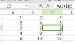 如圖,我們?nèi)匀蛔尩谝涣?第二列,此時我們輸入公式:“=A1+$B1”,此時我們保證了列是不變的,之后的操作一樣,如果我們輸入公式為:“=A1+B$1”,那么我們就保證了行不變的。