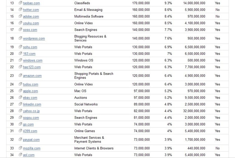 Google正式更新了全球排名前100名的網(wǎng)站排行版信息,國內百度擠入第8名,獨立訪問量3.1億,QQ排名第10名,獨立訪問是 2.5億,F(xiàn)acebook穩(wěn)坐名獨立訪問量為8.7億,58同城上升到在第78位,姚建波在微博表示,爭取今年進入全球前58名,相信對于國內90%的站長來說還是個夢,繼續(xù)努力。